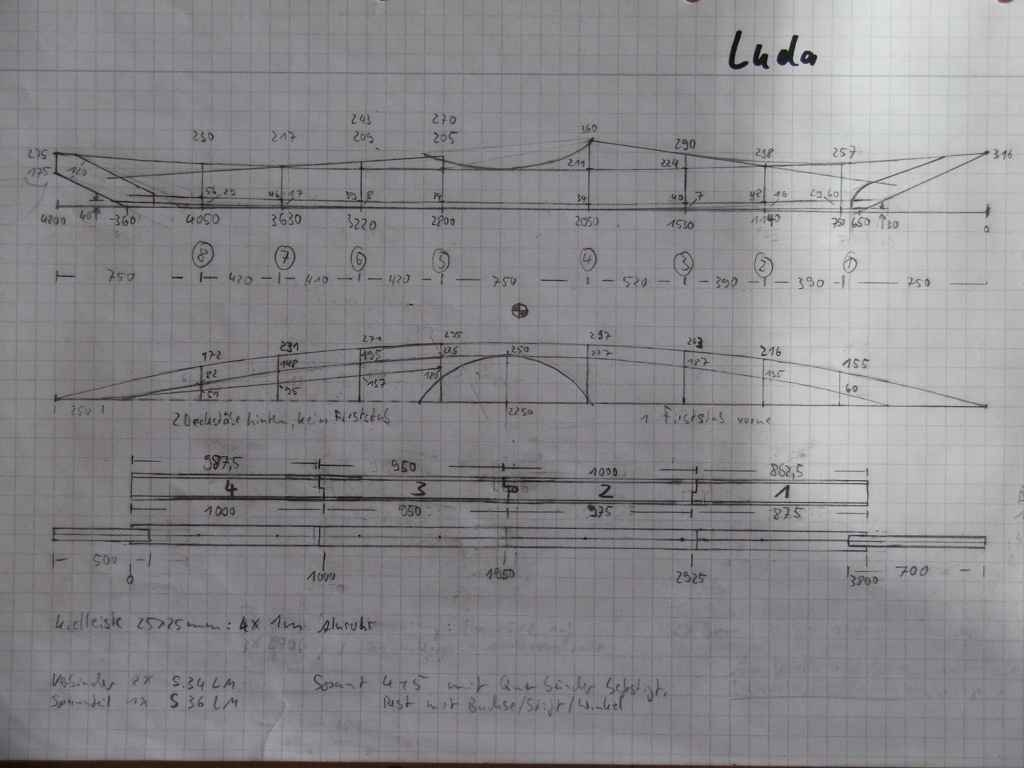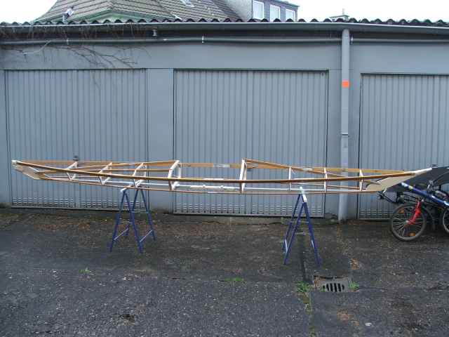 Die Decksleisten, eine vorne und zwei hinten, sind so weit wie möglich diagonal gestellt und enden innen auf den Stevenbrettern. Das hat zum einen optische Gründe: Das Deck ist im Bug- und Heckbereich flach, das gefällt mir und ist windschlüpfiger. Zum anderen nehmen die Decksleisten aber auch einige Biegekräfte auf und versteifen damit das Gerüst. Zusammen mit den recht stark dimensionierten Bordleisten ist das Gerüst tatsächlich sehr steif. (Nachdem ich es in Folie eingewickelt habe -siehe Kapitel Unterhaut- konnte ich es kaum noch verbiegen!)