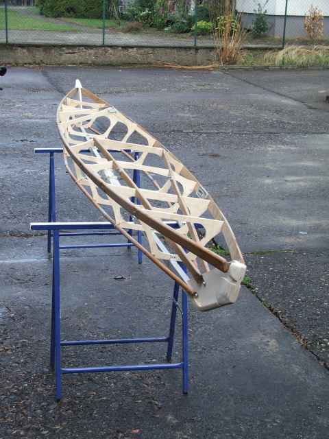 Die beiden Stevenenden haben abnehmbare Tothölzer, die später in der Hülle verbleiben. Das Gestell wiegt jetzt 11kg, was ich leicht finde. Aber es kommen ja noch Sitz und Süllrand dazu, ausserdem noch die Lackierung.
