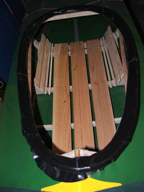 Seitlich unter dem Süllrand sind noch die Schenkelstützen zu erkennen. Sie nehmen die Druckkräfte auf, die von den Deckstäben kommen, wenn sich das Boot unter Last durchbiegt. Ausserdem bieten sie seitlichen Halt fürs Becken. Die Knie kann ich dahinter klemmen. Falls sie zu schwach dimensioniert sind ist eine Neuanfertigung schnell gemacht. Und polstern lassen sie sich auch noch :-)