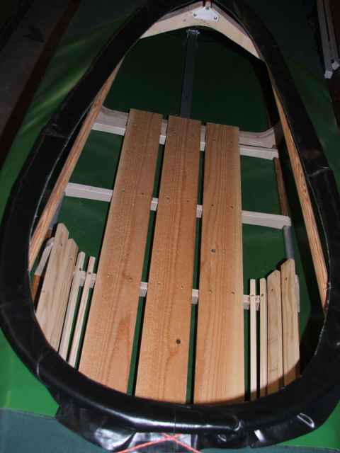 Seitlich sind die hinteren beiden der vier unterstützenden Sperrholz-Halbspanten hochgezogen und mit Leisten belegt. Die Breite habe ich genau meiner Beckenbreite angepasst. So habe ich guten seitlichen Halt und, wie Lorenz Mayr schreibt 'polstere Dich im eigenen Fleisch', halte mein 'Polster' zusammen.