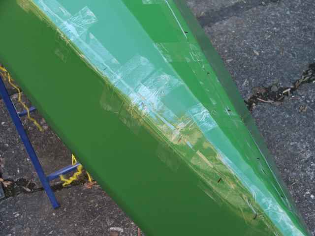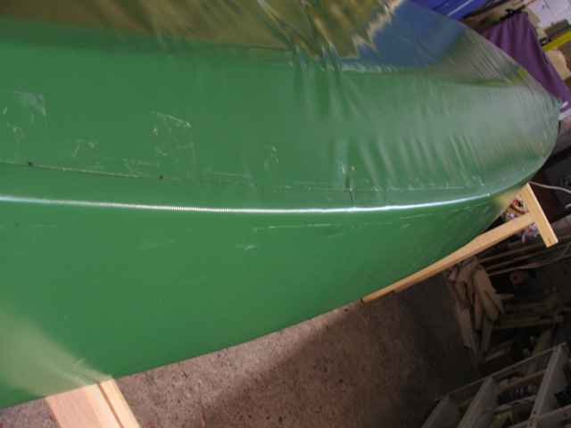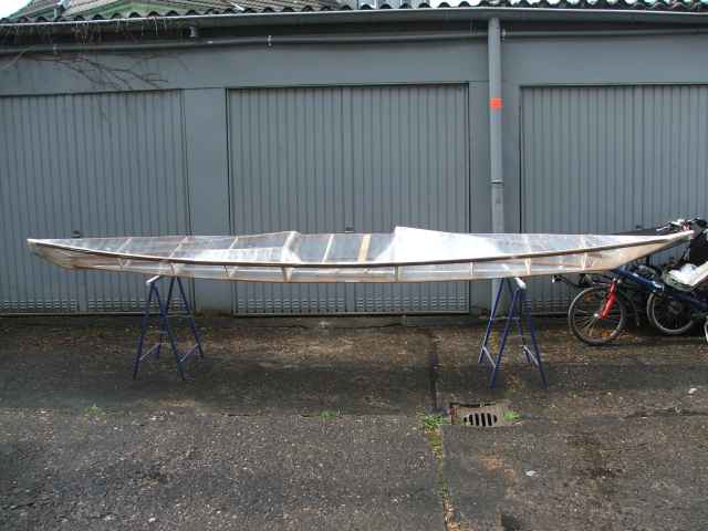 Weil der Aufwand so hoch ist würde ich beim nächsten Boot nicht wieder eine Schablone machen. Vielmehr würde ich ein Stück Plane in der benötigten Breite mit Übermass abschneiden und über das in Folie eingewickelte Boot legen. Dann in der Mitte auf 1 m Länge verschnüren und vorne und hinten mit den Brettchen und Zwingen stramm verspannen. Dann erst mal den Boden genau den Senten entlang plus 40mm zurechtschneiden. In der Bootsmitte ein möglichst langes Stück (> 1 Meter) nicht aufschneiden. Wenn der Boden stärker gekrümmt ist, dann vorne und hinten stramm verspannen. Nun die Seitenteile genau entlang der Senten schneiden. Die 40mm Übermass am Boden sind nun die Klebekante. Geklebt wird direkt auf dem Gerüst, wobei die Seitenteile den Boden überlappen. Genauso werden die Stevennähte gemacht: Eine Seite wird mit Übermass geschnitten, die andere genau auf Stevenbrett-Mitte. Mit der Methode muss die Haut weder zwischendurch vom Gerüst genommen werden, noch müssen die Klebenähte mit Klebestreifen fixiert werden. Auch werden keine Extrastreifen benötigt. An der Stelle, wo Boden und Seitenteil zusammenkommen muss noch ein Flicken aufgeklebt werden. Das kann man später auch von innen machen. Zu überlegen wäre noch, ob Kielstreifen und Sentenstreifen aufgeklebt werden sollen. Ich würde sie erst mal weglassen, dann lässt sich die Haut einfacher falten.