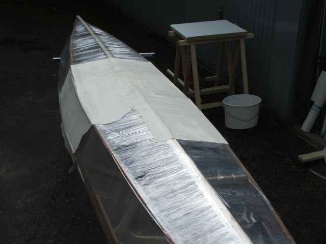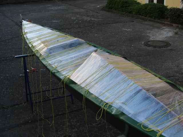 Stück für Stück von der Mitte beginnend nach aussen wird die Haut mit Klebestreifen von aussen zusammengesetzt und unten rum über Deck mit Schnur abgespannt. Der mittlere Hautteil liegt immer zuunterst, wenn sich die Nähte überlappen. Die Frischhaltefolie auf dem Gerüst ist eine gute Hilfe bei diesen Arbeiten. Man hat eine Auflagefläche und muss nicht frei in der Luft hantieren.