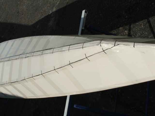 Bevor ich aussen die Sentennähte überkleben konnte mussten erst mal die Haut wieder auf dem Gerüst verschnürt werden und dann alle Klebestreifen runter. Wenn man die beim Abziehen mit dem Fön warm macht, bleibt nicht ganz so viel Kleber an der Hülle haften.