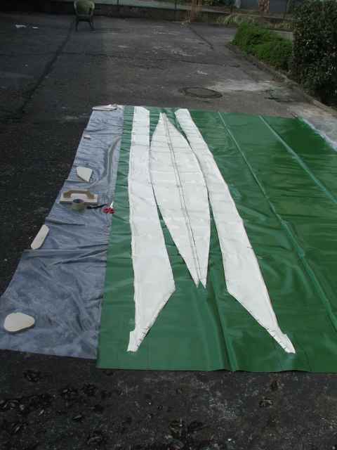 Die Schablone habe ich erst entlang der Steven aufgetrennt und dann entlang der Senten. In der Bootsmitte ist ca. 1 Meter nicht aufgeschnitten. Es reichte auch so um flach zu liegen. Die Schablone habe ich mit Klebestreifen auf dem Hüllenmaterial festgeklebt. Beim nächsten mal würde ich die Plane glatter auslegen.