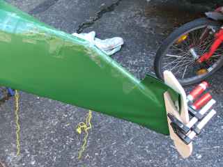 Bug und Heck sind mit Brettchen und Zwingen an den 'Lappen' eingespannt. Dabei muss die Haut schon straff sitzen. Das musste ich mehrfach nachspannen. Die Bugspitze liegt in den Aussparungen der Brettchen (Bild links), so kann nichts verrutschen.