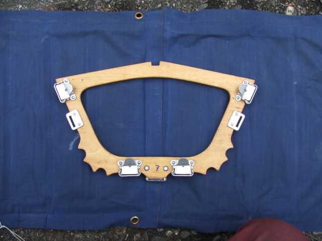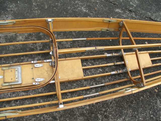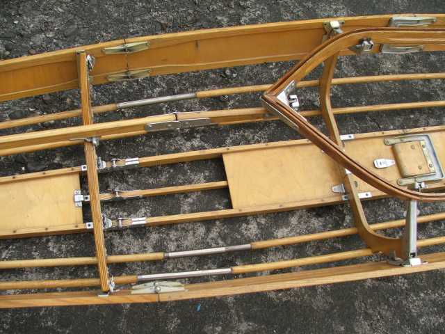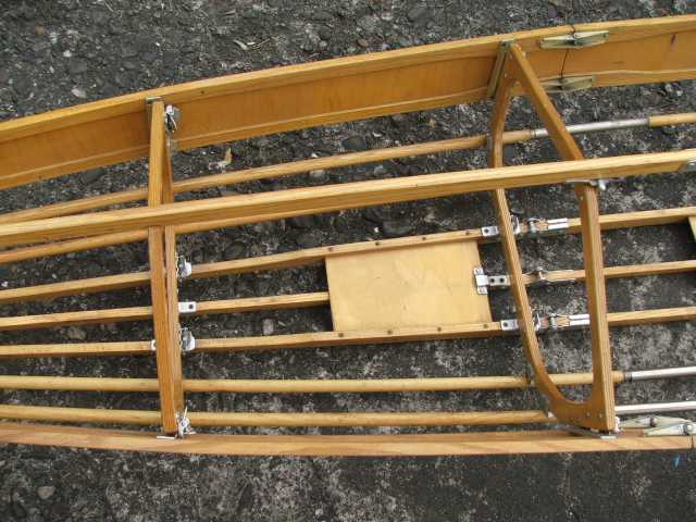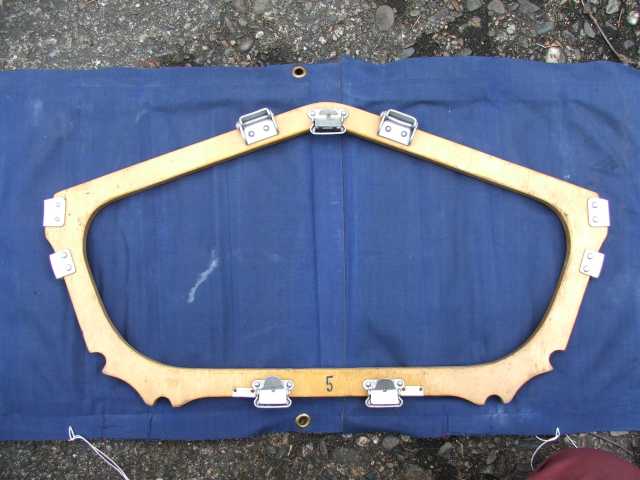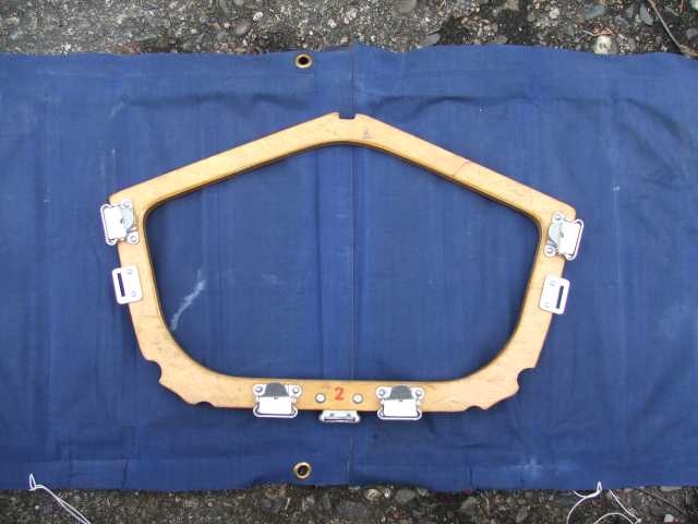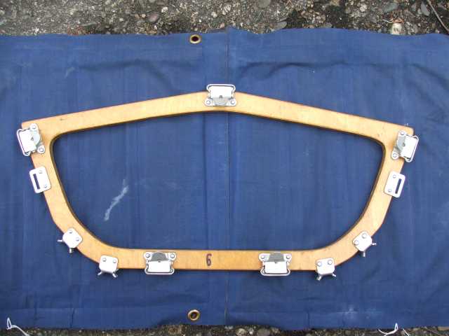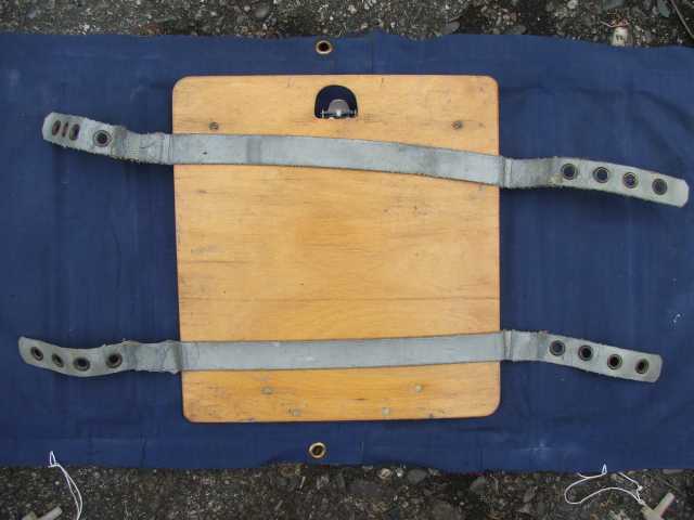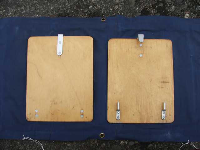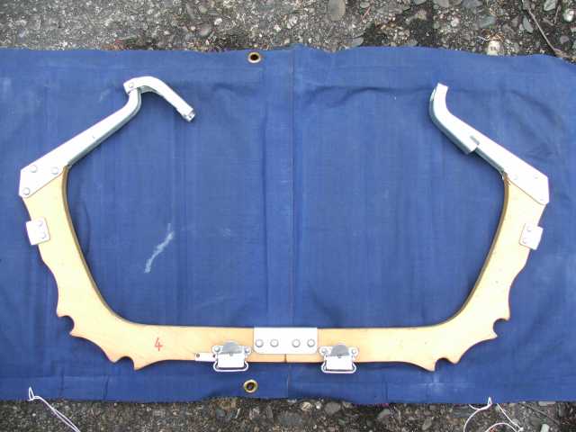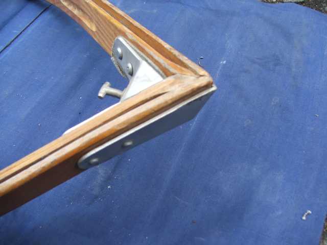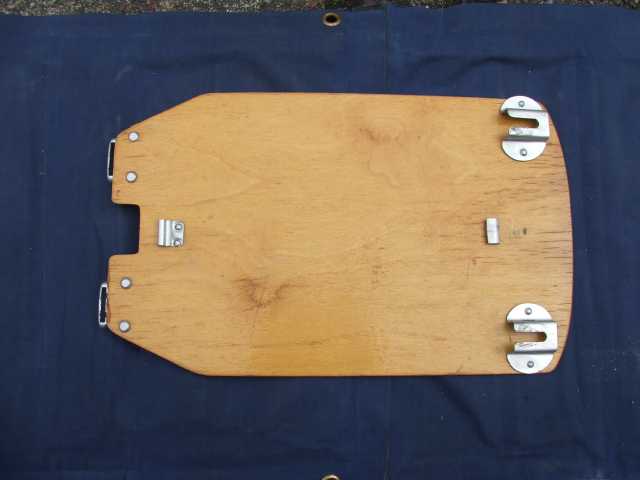 Rückenlehne von hinten. Die Beschläge rechts greifen in den Spant 6 ein und sichern gleichzeitig den Süllrand am Spant. Die kleinen Beschläge auf der Holzfläche dienen zum Befestigen des original Sitzpolsters. Dieses habe ich auch, es ist aber undicht.