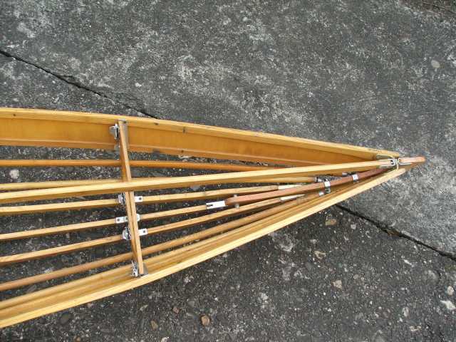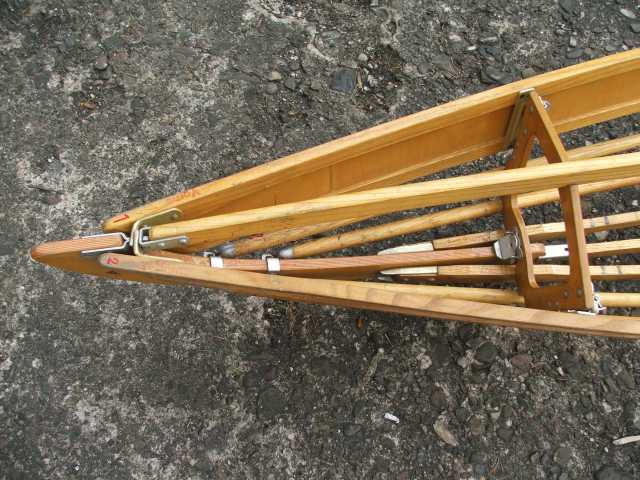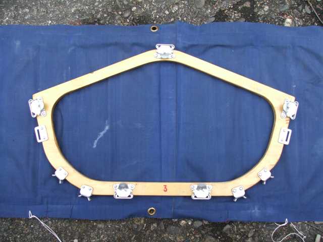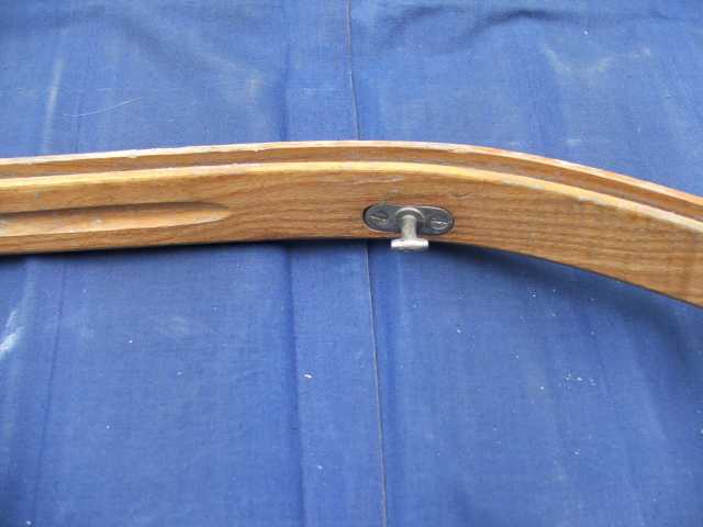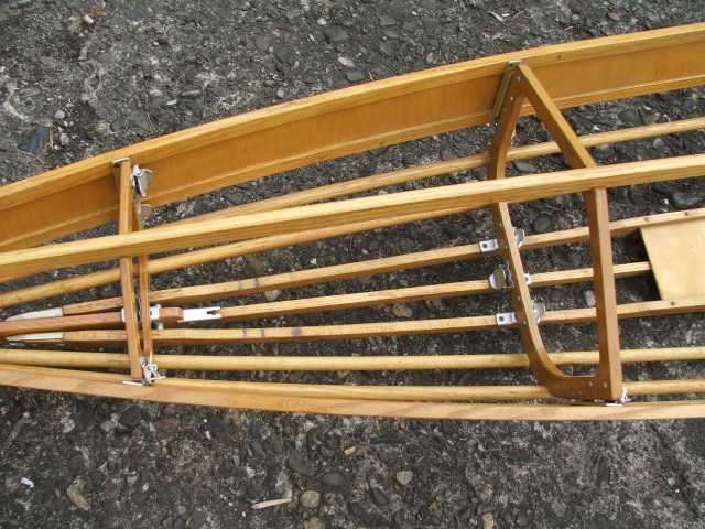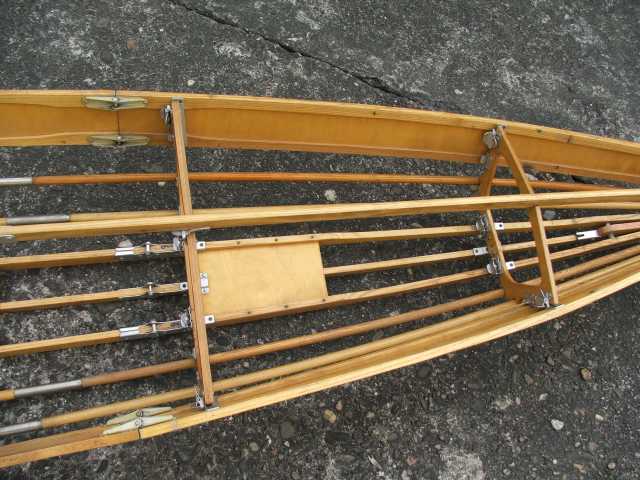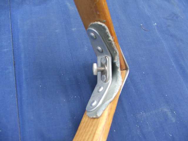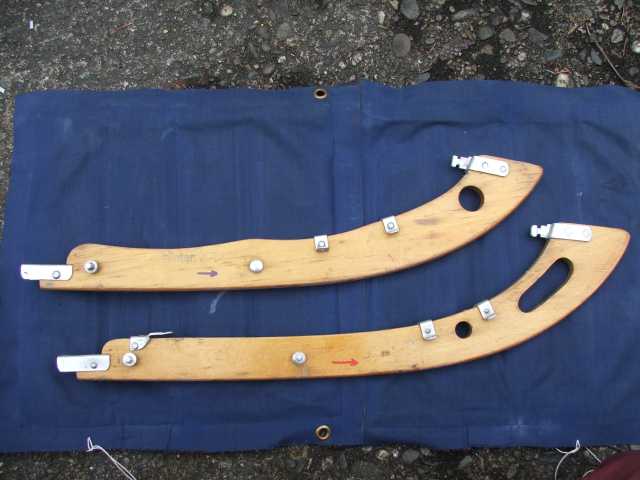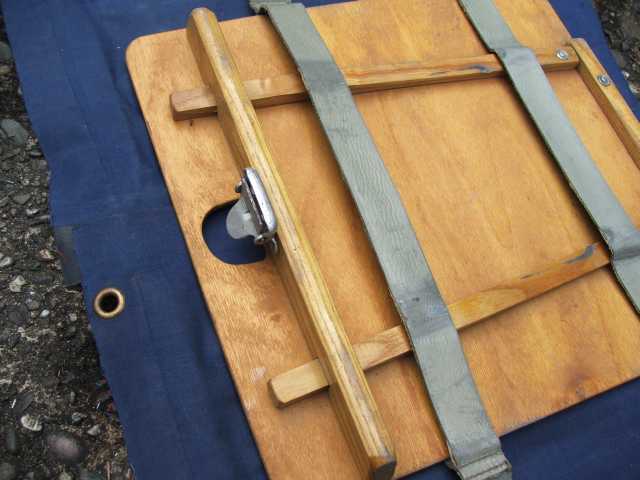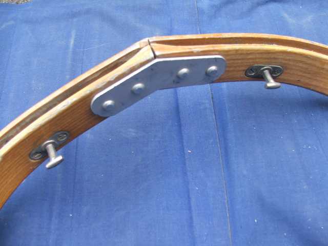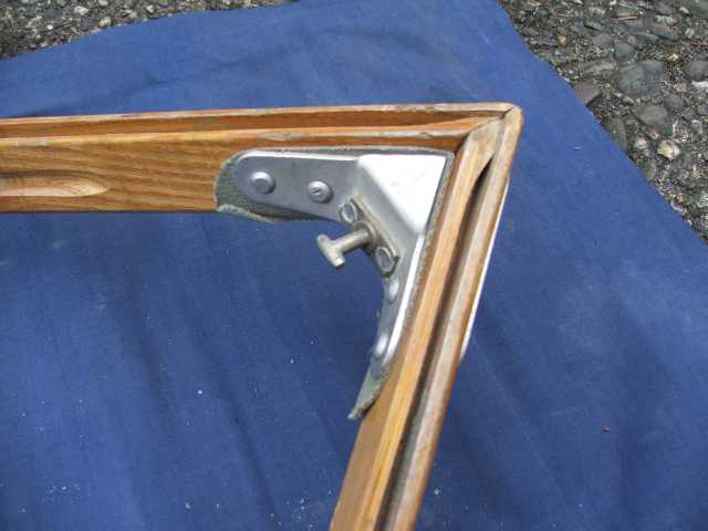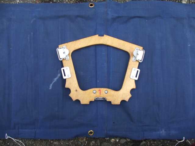 Rückenlehne von hinten. Die Beschläge rechts greifen in den Spant 6 ein und sichern gleichzeitig den Süllrand am Spant. Die kleinen Beschläge auf der Holzfläche dienen zum Befestigen des original Sitzpolsters. Dieses habe ich auch, es ist aber undicht.