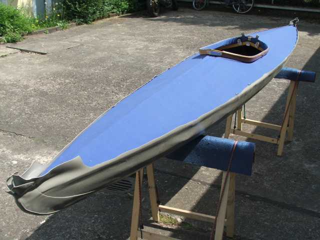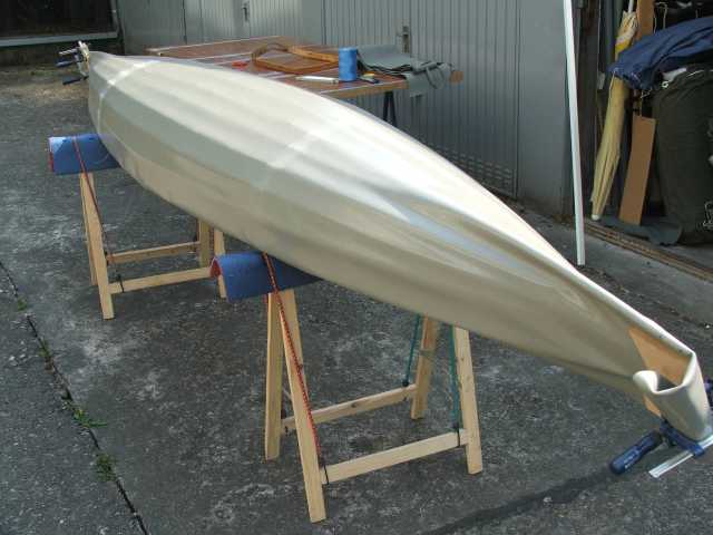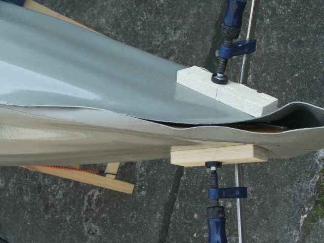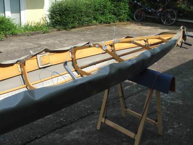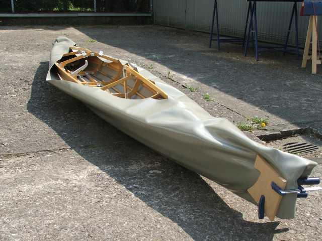 Das Gerüst wird dann in diese 'Haut' hinein aufgebaut. Wie man hier sieht, ist seitlich noch alles sehr schlaff, während es am Kiel schon genug Spannung hat. Nachdem ich um 3cm verkürzt hatte, passte es schon besser.