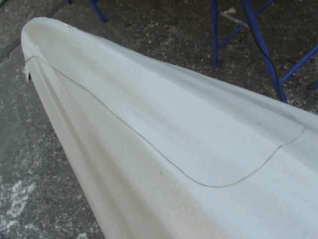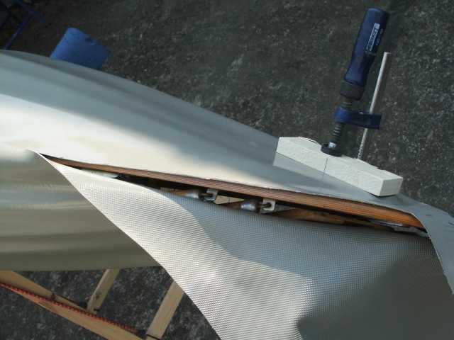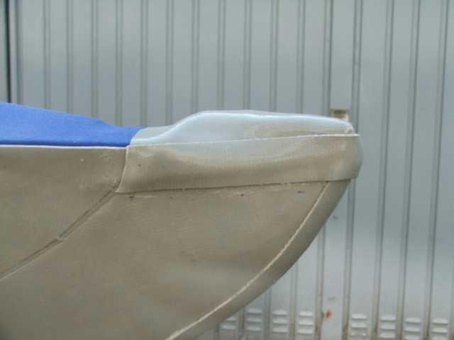 Der vordere Beschlag ist leider zu weit nach vorne geraten und musste entfernt werden. Beim nächsten mal markiere ich mir lieber die Spantenpositionen auf dem Deckstoff, um das besser ausrichten zu können. Die Steven werden nun zuende bearbeitet. Zunächst die Seiten nach oben schliessen. Dann den Abdeckstreifen drüber kleben.