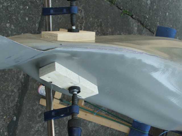 Ist alles ausgerichtet wird mit dem Heissluftfön und der Andruckrolle die Klebung zusammengefügt. Später habe ich die Klebung noch einmal nachgerollt, als ich die Hülle auf dem Tisch liegen hatte. Dabei habe ich auch die Kanten zwischen Oberdeck und Hülle beschnitten.