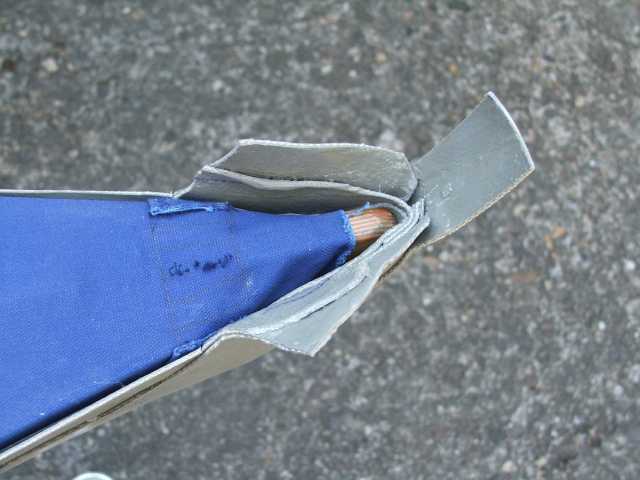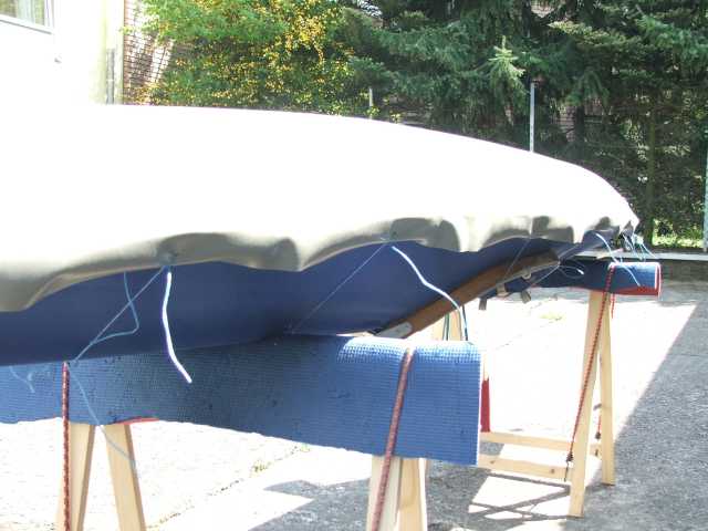Das Oberdeck wird auf das Gerüst gespannt und die PVC-Streifen mit Kleber bestrichen. Auch an der Hülle wird innen die Klebestelle mit Kleber bestrichen. Das muss jetzt gut abtrocknen, bevor die Hülle wieder auf das Gestell aufgezogen wird. Dabei musste ich das Gestell teilweise demontieren, um es in die Haut zu spannen.