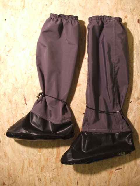 Aus dem gleichen Material sind diese Rollstiefel entstanden. Die Sohle ich aus LKW-Plane, die Seitenteile vom 'Schuh' aus Plane einer alten Ortliebtasche, und die Schenkel aus den letzten Resten des Goretex-Stoffes. Alles ist vernäht und mit Seam Grip abgedichtet. Die Abdichtung habe ich allerdings nicht 100%ig hinbekommen.