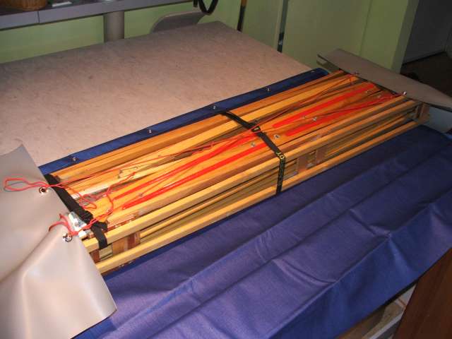 Einpacken: Das Stabpaket fixiere ich zuerst mit einem Gurt, dann wird es auf der Plane ausgerichtet. Die Endlappen werden mit Schnüren über Kreuz verbunden. So kann da schonmal nichts mehr rutschen.