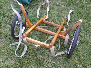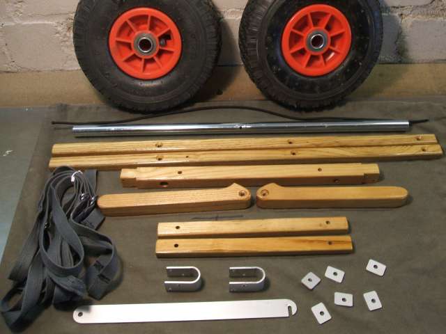 Für meinen Eigenbau verwende ich Eschenholz, teils von alten Leisten aus meiner Sammlung vor dem Feuer geretteter Altteile, teils aus einer Eschenbohle herausgeschnitzt. Als Räder nehme ich dicke Luftreifenräder mit Kugellager, bestimmt nicht die leichtesten, und im Boot auch eher voluminös, aber für 'ernsthafte' Transportaufgaben bewährt.