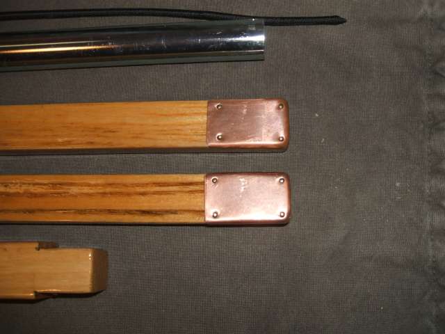 Die Unterseite des langen Endes der Längsleisten sind mit Kupferblech geschont, weil hier der Bootswagen auf den Boden aufgestellt wird. Alle Holzteile sind 6-fach mit verdünntem Klepperlack lackiert.
