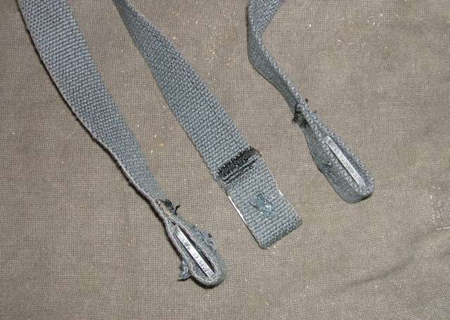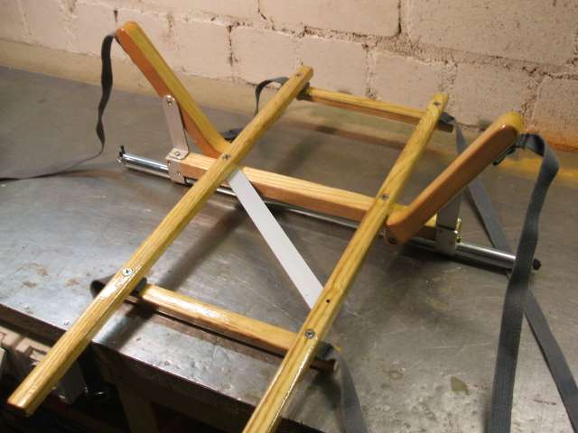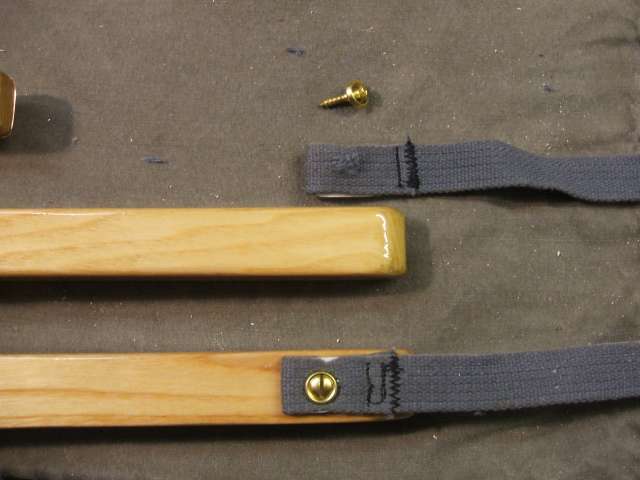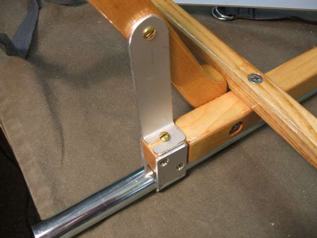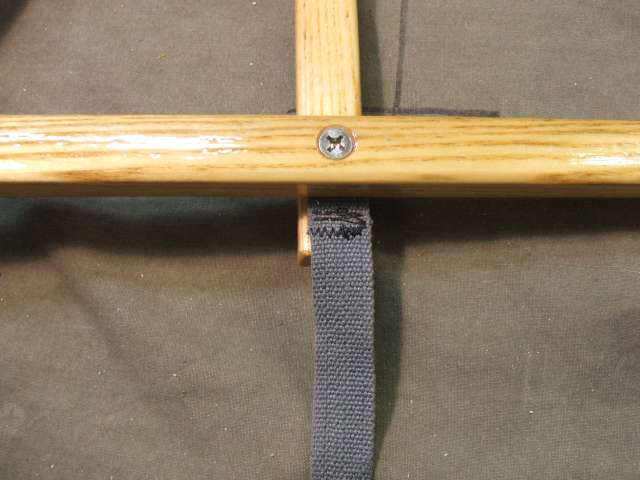 Die gelochten Alublechstücke (20x25mm) werden in Schlaufen der Gurte eingesetzt, dieses Ende wird mit dem Gestell verbunden.