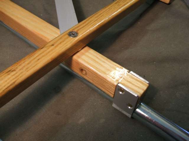 Schellen aus Alu halten das Achsrohr. Die Schellen sind in das Holz eingelassen, und werden mit 4 Schrauben gehalten. Auf der Rückseite sind die Schraubenlöcher entsprechend andersrum diagonal gesetzt, dass sich die Schrauben nicht in die Quere kommen.