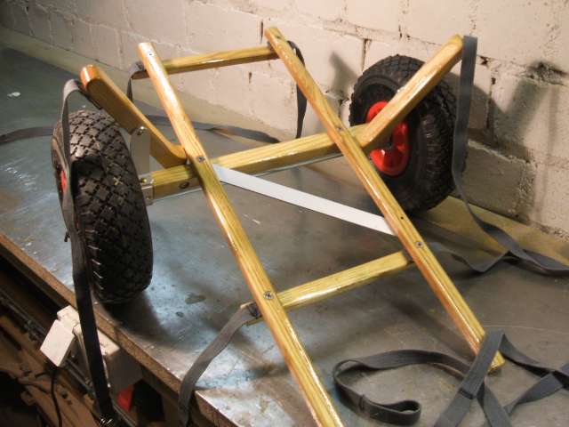 Der Bootswagen einsatzbereit. Wie stabil der ist wird die Praxis zeigen. Besonders bei einseitigen Schlägen in steinigem Gelände bin ich gespannt, ob da nichts ausbricht. Auch vollbeladen Treppe rauf und runter wird getestet.