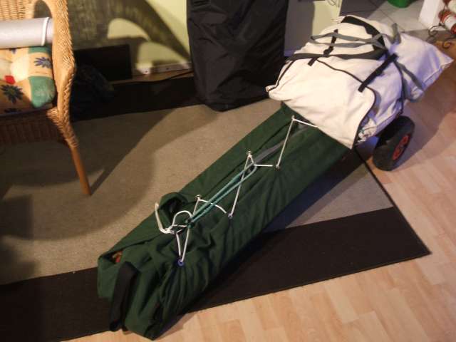 wenn man den bepackten Bootswagen mal aufrecht in die Ecke im Zug stellen will, verrutscht alles. Die Hauttasche auf der Stabtasche