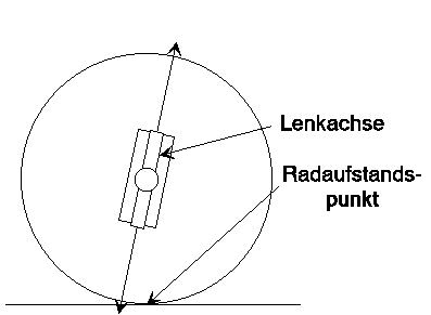 Die Lenkachse zeigt vor den Radaufstandspunkt, das ergibt den Nachlauf. Dieser zwingt das Rad, unter Last immer nach innen zu lenken. Dadurch wird die Lenkung immer in Geradeausstellung zurückgeführt, da sich die Kräfte von beiden Vorderrädern aufheben.