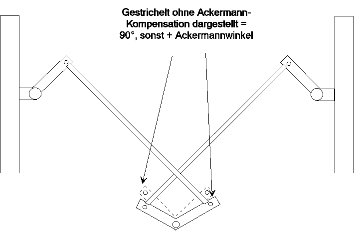 In einer Kurve muss das kurveninnere Rad stärker einschlagen als das kurvenäussere, es fährt ja auch einen engeren Kurvenradius. Um das zu bewerkstelligen wenden wir die Regeln nach Ackermann an.