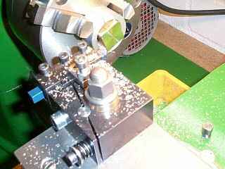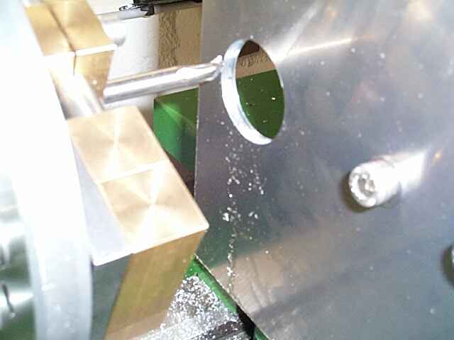 Damit es kein langes Raten gibt, hier schon mal die Anwendung: Ein vorgebohrtes Loch in einem Blech wird ausgedreht. Dazu muss das Blech natürlich am Oberschlitten befestigt werden. Mit meiner Ausdrehvorrichtung kann ich Löcher bis ca. 70mm Durchmesser ausdrehen. Das will ich später auch im Rahmenbau verwenden.