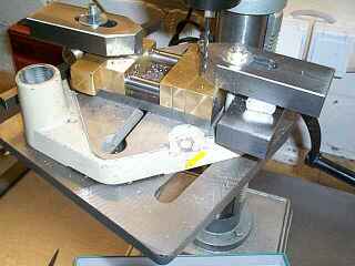 Die Bohrungen für die vier Halteschrauben gehen durch die Silberstahlstäbe hindurch. Damit später alles passt habe ich das mit Hilfe dieser kleinen Spannplatte (die ist von einem alten Bohrständer übriggeblieben) fertig zusammenmontiert festgespannt.