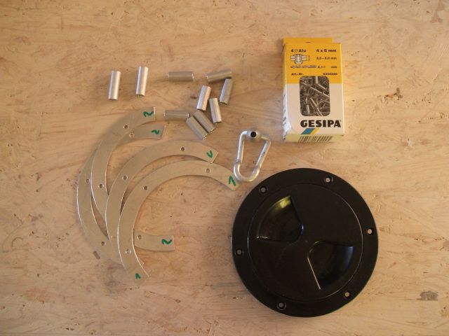 Die Einzelteile: Halbringe aus 2mm Alublech (ist materialsparender als Vollringe), 4mm Popnieten und die Luke. Der Rest auf dem Bild gehört nicht hierher.