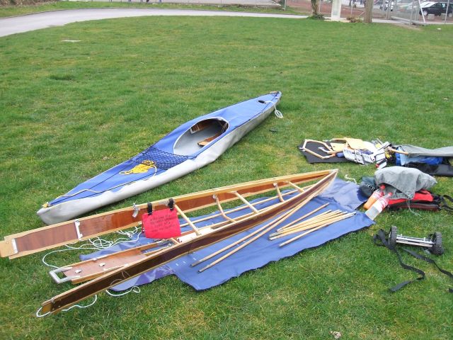 Im Kanusack herrscht Ordnung: Die Haut passt in einen Bundeswehr-Kleiderbeutel rein, Süllrand, Spanten und sonstiger Kleinkram in einen zweiten. Ein dritter Kleiderbeutel enthält alle Paddelkleidung, Trockenanzug, Paddeljacke, Paddelhose, Kajakschuhe, je nach dem was gerade gebraucht wird. Dazu kommen noch Schwimmweste und Tagesgepäck, dann ist der Kanusack schon voll und auch schwer genug.