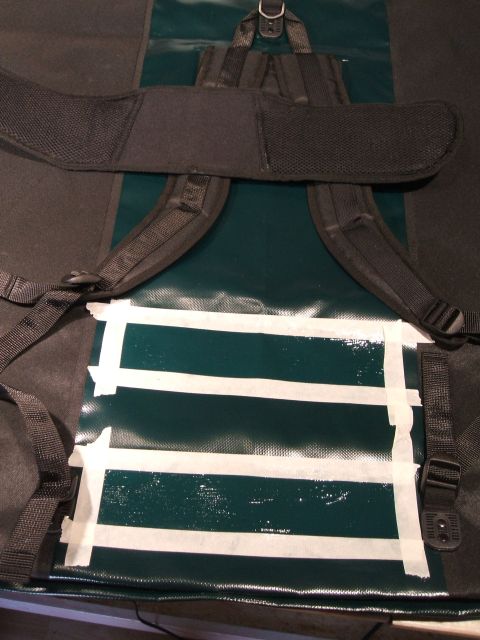 Eine Hüftgurt konnte ich von einem anderen Rucksack borgen. Dafür musste ich nun noch eine Befestigung aus PVC fertigen, natürlich geklebt. Die Klebestellen werden mit Klebeband abgeklebt.