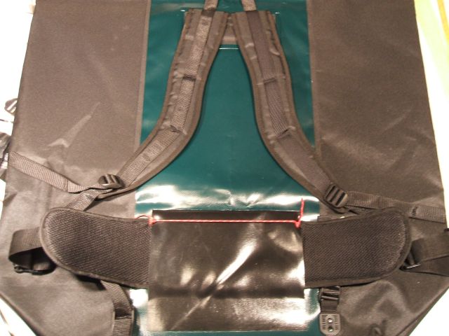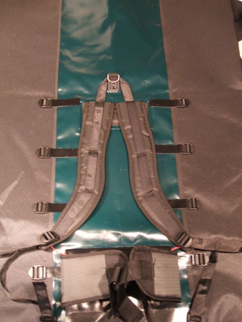 Auf der Aussenseite sind im unteren Bereich noch Gurte angenäht, nach dem Vorbild der üblichen Stabtaschen. Hier können die Gurte eines Bootswagens durchgefädelt werden, und einen Handgriff stellen sie auch dar. An einem 110cm langen Stück Gurt von 50mm Breite habe ich an beiden Enden noch Packriemen von 20mm Breite angenäht. Diese kann ich dann um die Stabtasche schnallen und erhalte einen Schultergurt zum Tragen.