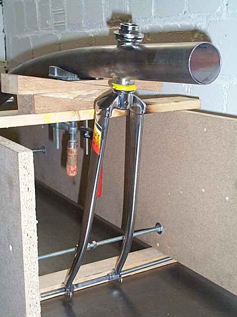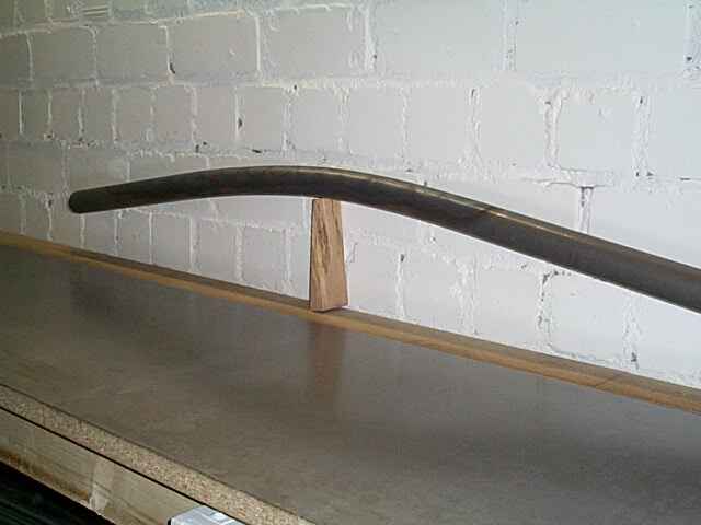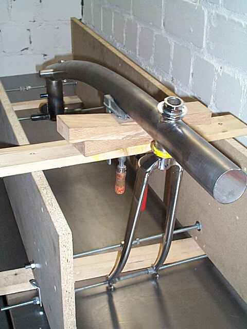Das selbstgebogene Hauptrahmenrohr. Zum Biegen habe ich das Rohr mit Sand gefüllt und die Enden mit Holzformteilen verschlossen. Dann habe ich das eine Ende des Rohres auf der Werkbank befestigt (Holzstücke und Schraubzwingen). Gebogen wurde stückweise, indem ich an die jeweilige Biegestelle einen Holzstapel untergelegt habe und dann eine Stelle von ca. 5cm Durchmesser auf der Rohroberseite rotglühend erhitzt habe. Dann lässt es sich mit einiger Kraft ein Stück weit biegen. So habe ich mich in zwei Durchgängen am Rohr entlanggearbeitet und den überstehenden Meter vom Rohr, der anschliessend abgesägt wird, als Hebelarm benutzt.