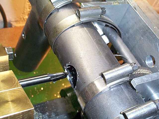 Auf der Drehbank drehe ich die Bohrungen für die Lagerrohre aus: Zuerst aufbohren auf 8mm, 15mm und 20mm, dann mit der Ausdrehvorrichtung auf die endgültigen 22mm. Das Rahmenrohr wird dabei mit einer Aufspannvorrichtung gehalten, die ich mir aus Aluwinkeln und Schlauchschellen gebaut habe.