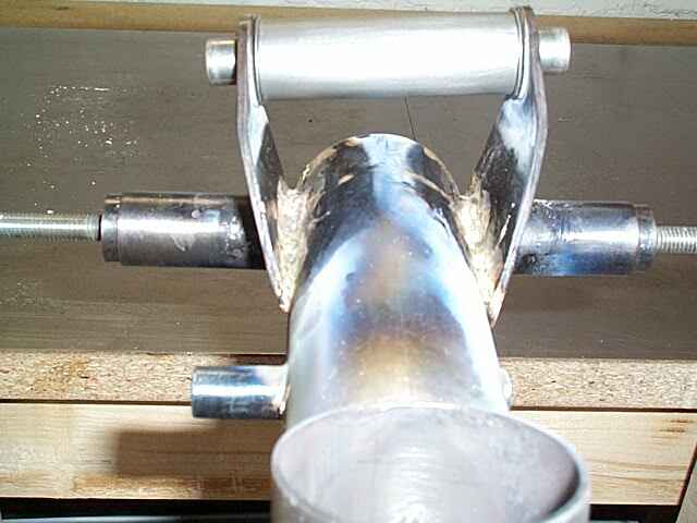Das untere Querohr wird eingepasst und anschliessend verlötet. Als Klemmhalterung habe ich mir ein Kegelstück aus Stahl gedreht, das mittig ein M6-Gewinde hat. Mit einer Gewindestange und einem Stück durchbohrtem Alu-Flachmaterial wird das Querrohr nun festgespannt.
