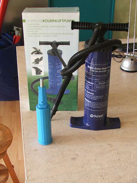 Die Luftschläuche müssen mit einer Pumpe aufgepumpt werden. Ich verwende dafür so eine 2x2L-Pumpe.