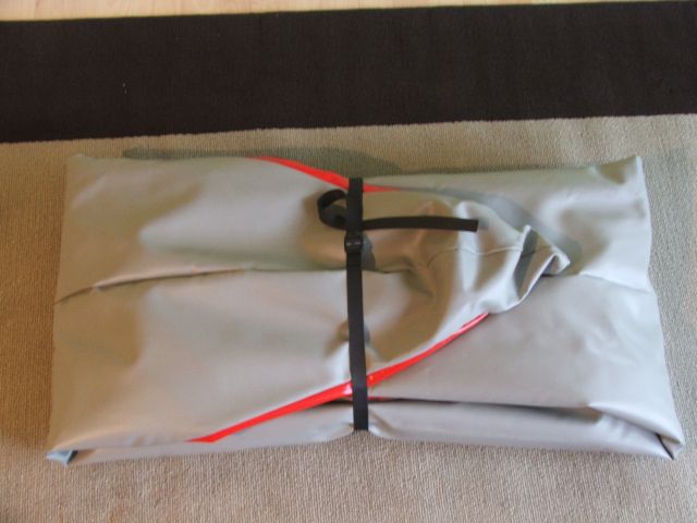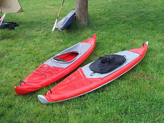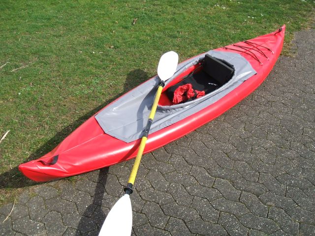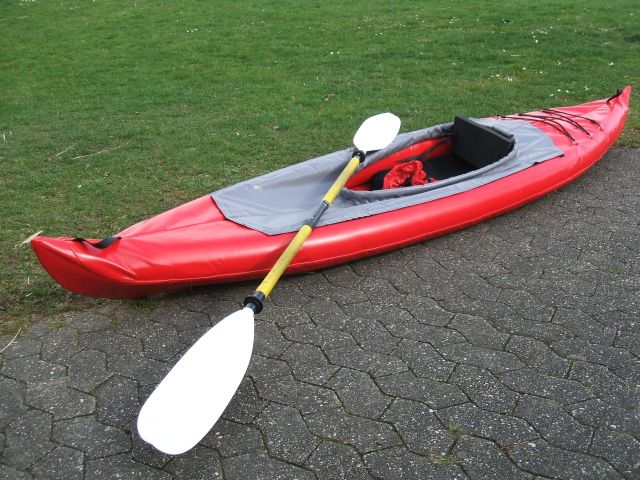 Zum Aufbau: Hülle ausbreiten, Kielrohrhälften einführen, dabei darauf achten, dass nichts zwischen Rohr und Hülle eingeklemmt wird. In der Mitte mit der Hülse verbinden. Die beiden Bodenplatten an die vorgesehenen Positionen auf das Alurohr clipsen und die seitlichen Kanten unter die Schläuche klemmen, wo die Verstärkungen sind. (Eine Bodenplatte bildet den Sitz, die andere die Fersenstütze). Die Luftschläuche werden nun mit einer Pumpe leicht aufgepumpt, gerade so, dass sie Form annehmen. Jetzt in den Bootsspitzen kontrollieren, dass die Schläuche gut nebeneinander sitzen (was sie normalerweise von alleine tun). Dann die Luftschläuche prall aufpumpen (200 Millibar). Zum Schluss noch die Spritzdecke festkletten, hinten beginnend und abwechselnd seitlich nach vorne weiter andrücken. Fertig!