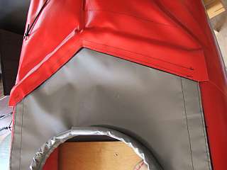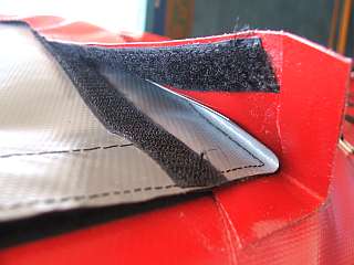 Die Spritzdecke wird mit Klettband befestigt. Sie ist so geschnitten, dass der Paddler mit den Knien den Süllrand anheben kann