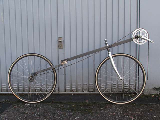 Der Rahmen besteht aus einfachem Vierkantstahl, wiegt ca. 3,5kg und ist gelötet, schweissen wäre hier aber einfacher gewesen. Die hinteren Ausfallenden habe ich aus 5mm starkem Bandstahl selbst geschnitzt. Die Gabel ist aus Alu.