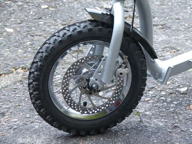 Am Vorderrad habe ich eine Scheibenbremse eingebaut. Ein bisschen übertrieben vielleicht, aber auf den Felgen konnte man nicht vernünftig bremsen und die Scheibenbremse hatte ich noch rumliegen. Die Scheibenbremsnabe musste ich selber einspeichen. Das Ergebnis ist ziemlich improvisiert. Ich musste eine 36-Loch Nabe auf eine 20-Loch Felge einspeichen und hatte nur die ursprünglichen Speichen zur Verfügung. Davon habe ich 16 Stück verwendet und die möglichst gleichmässig verteilt.