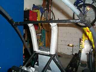 Hinter dem Sitz ist noch mal ein Querrohr angebracht. Es hat auf beiden Enden jeweils ein Rohrstück angelötet, wo das Kohlerohr durchgeht.