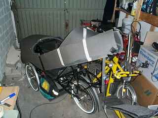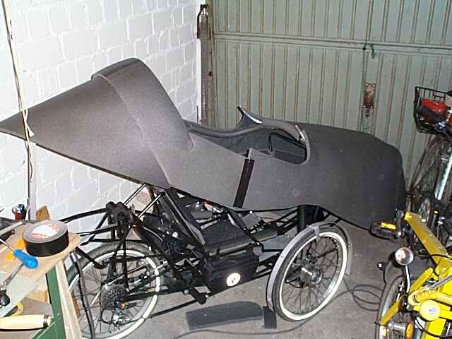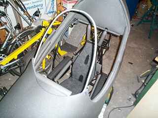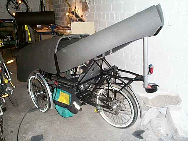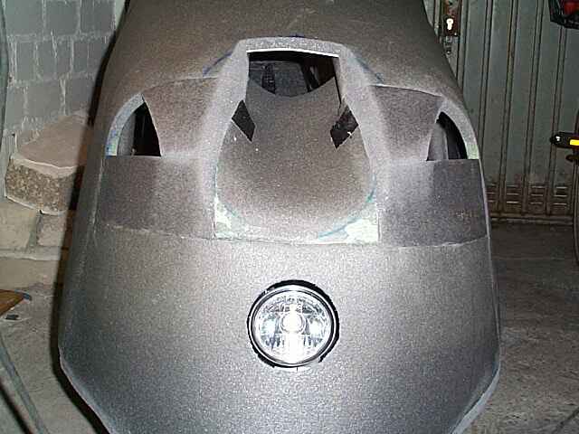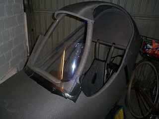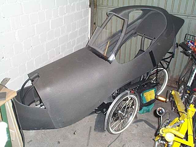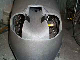 Und so siehts inzwischen aus, einigermassen schlank. Man kann schon den Übergang zwischen Frontscheibe und Seitenscheiben erkennen. Die Frontscheibe habe ich weiter als geplant nach vorne gesetzt. Sie beginnt schon vor den Knien, dadurch bleibt mehr Bewegungsfreiheit.