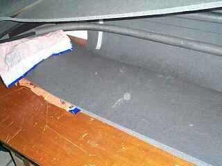 Da die Seiten der Verkleidung so stark gewölbt waren habe ich von innen eine zweite Lage Schaummatte eingeklebt. Bei der Verklebung habe ich Folie zwischengelegt und beim Andrücken stückweise herausgezogen. So kann man das besser ausrichten, die Folie verhindert, dass alles mit dem Pattex auf erste Berührung zusammenpappt.