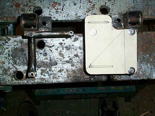 Die Änderung betrifft hauptsächlich die Achsschenkel. Zur Aufnahme der Spurstange und der Lenkstangen verwende ich nun ein Alublech 5mm, welches angeschraubt wird. Links im Bild sind die eingelöteten Gewindebuchsen zu erkennen, rechts eine Sperrholzschablone für das Alublechteil. Die Form der Schablone ist noch nicht endgültig.