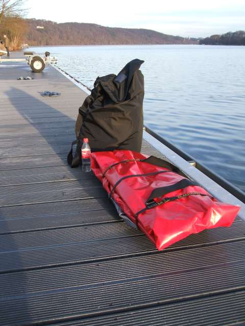 Mit meinem kleinen Gecco kam ich ganz entspannt per S-Bahn ans Wasser. Meine übrige Paddelausrüstung wog mehr als das Boot. Denn um sich den unbilden des Winters zu stellen bedarf es neben Schwimmweste und Paddel auch noch eines Trockenanzuges, Neoprensocken und Neoprenkappe. Kamera und Futteralien kommen noch erschwerend hinzu!