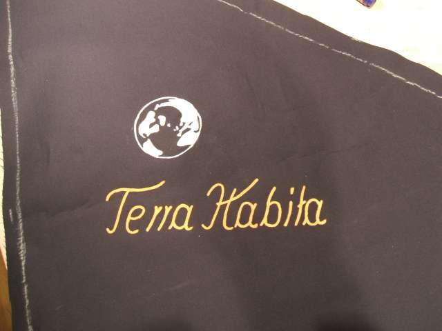 Die einzelnen Etaproof-Bahnen wurden mit Schablonen angezeichnet und ausgeschnitten. An der Vorderseite ziert dieses Logo das Zelt mit seinem Namen. Terra Habita ist eher lyrisch als auf irgendeine konkrete Sprache bezogen, Terra ist die Welt, und Habita heisst so viel wie wohnen, zu Hause sein.