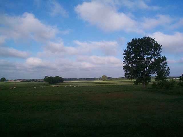 Typische Niederrheinlandschaft: Wiesen, Weiden, Felder, Baumgruppen.