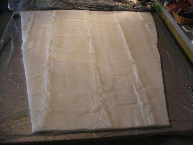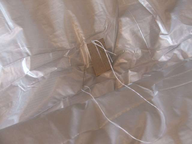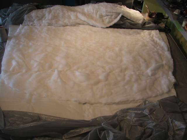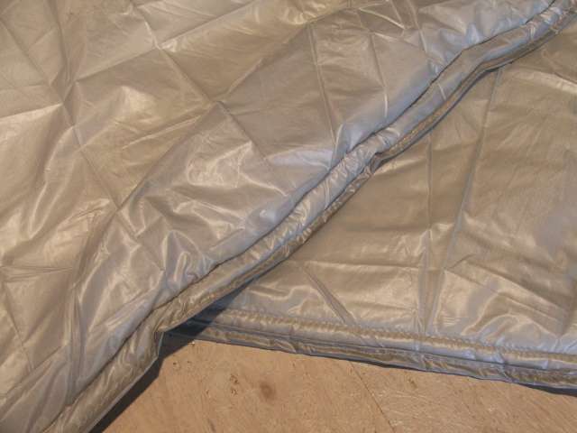 Die oberen 80cm sind aufgedoppelt mit einem Reststück von einem anderen Projekt. Die Form ergab sich dabei eher zufällig. Damit sollte die Decke in meinem 'Frierbereich' schön warm halten, an Beinen und Füssen friere ich nicht so leicht. Die Teile der Isolierung wurden dann mit Nadel und Faden in 50mm weiten Stichen locker zusammengesetzt.
