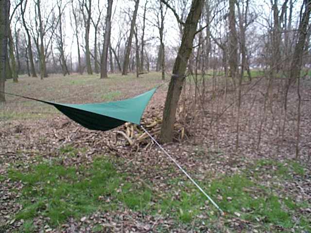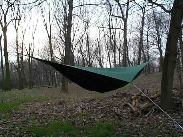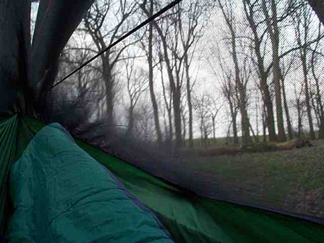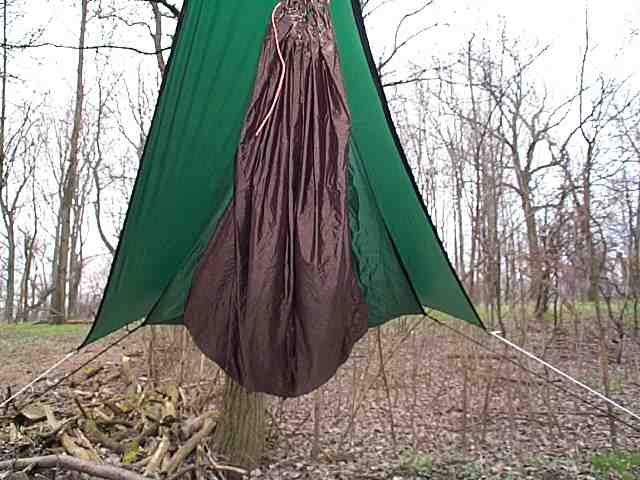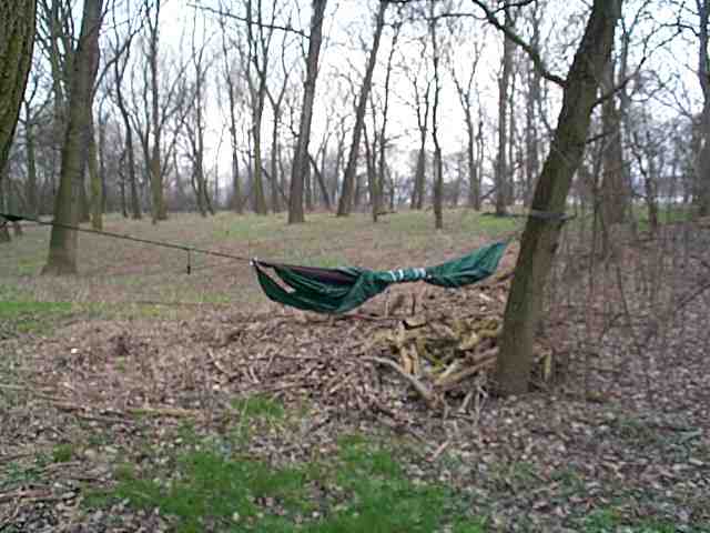 Okay, zurück aus meiner Wohnung wieder im Wald: Ein Schafsack wärmt nicht da, wo er zusammengedrückt wird, also unten. Im Zelt verwendet man daher eine Isomatte als wärmende Unterlage. Das ist in einer Hängematte nicht so einfach. Die Isomatte würde die ganze Sache kompliziert machen.