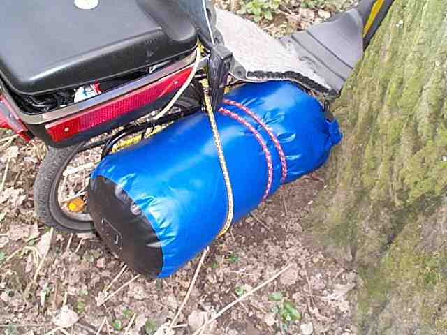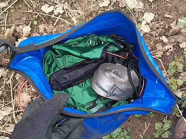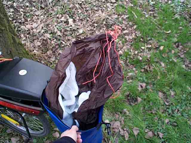 In diesem 35 Liter Ortliebsack steckt (von unten nach oben) mein (alter Kunstfaser-)Schlafsack, die Nusschale (eine Unterbodenisolierung, mehr dazu weiter unten) und schliesslich die HH, die nur noch sehr wenig Platz in Anspruch nimmt. Der ganze Sack wiegt 4,5 kg. Annähernd soviel hat bisher bei mir schon alleine das Zelt gewogen und fast genauso viel Stauraum eingenommen.