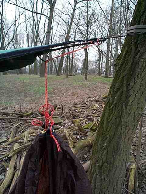 Die Befestigungsschnur des Kopfendes wird erst durch einen Schlüsselring gezogen, den ich extra für diesen Zweck mit einem Kabelbinder befestigt habe. Dann wird es an einen kleinen Karabinerhaken eingehängt. Der Karabinerhaken ist an einer Schnurschlaufe um das Tragseil befestigt.